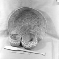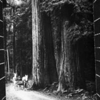 This image illustrates items from Indigenous tribes around Humboldt County. Indigenous peoples most commonly used Redwood as their material for… A man in a buggy being pulled by a two horse team through the Humboldt redwoods. |
