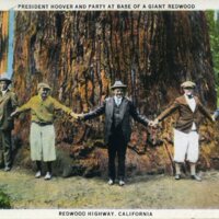 A team of workers poses in the undercut of a huge redwood tree. A postcard of President Hoover, and a group of friends, visiting the Avenue of the Giants prior to his inauguration. |