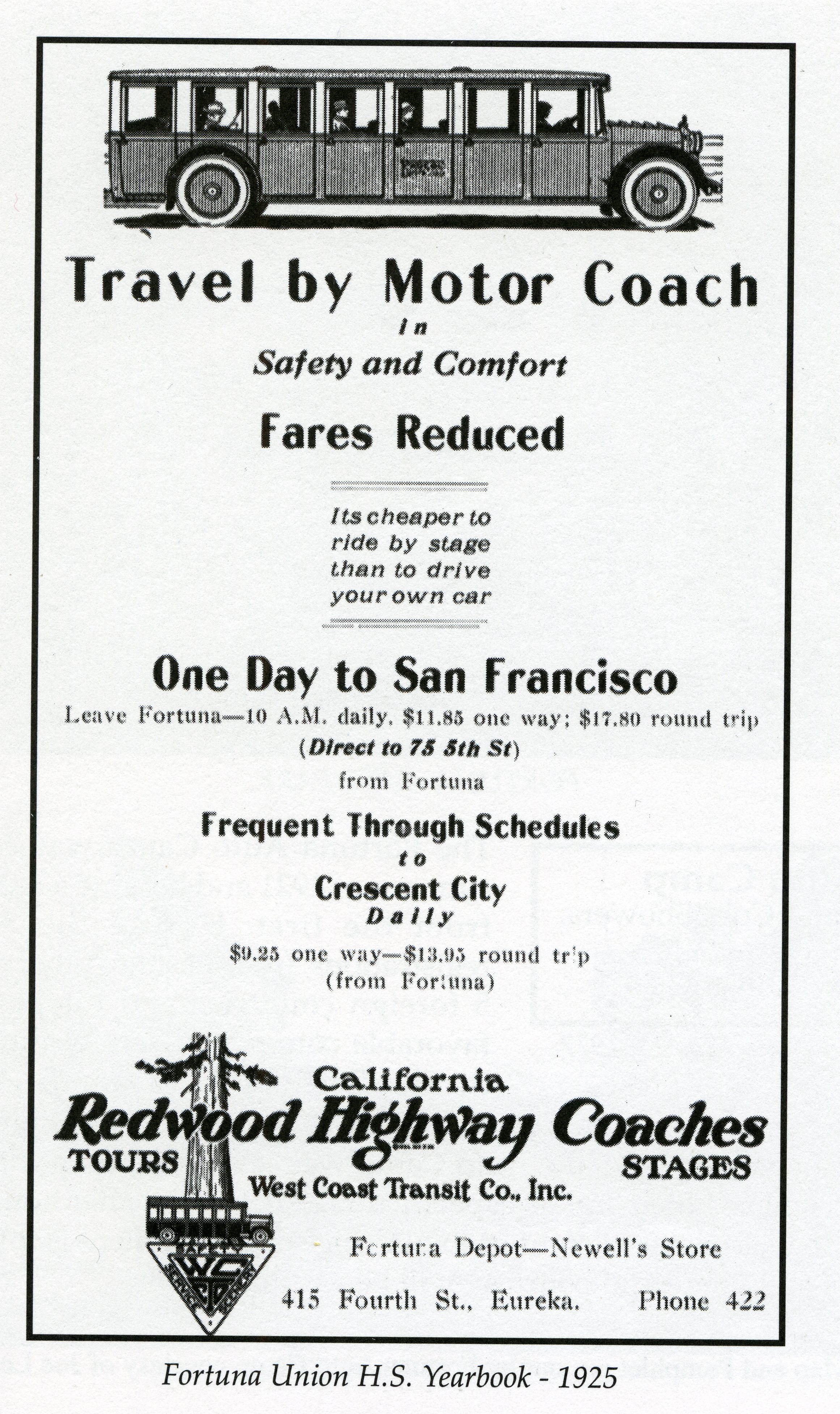 A list of fare prices and tours from Crescent City and the Redwood Coast to San Francisco and back; circa 1925.