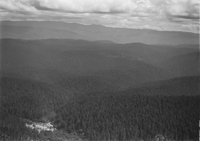 Looking East up watersheds of Lost Man's Creek and Little Lost Man's Creek. Geneva mill at lower left on Redwood State Highway 101. Altitude of 4500-4000-2000 ft. Location information from photograph at Redwood National Park.