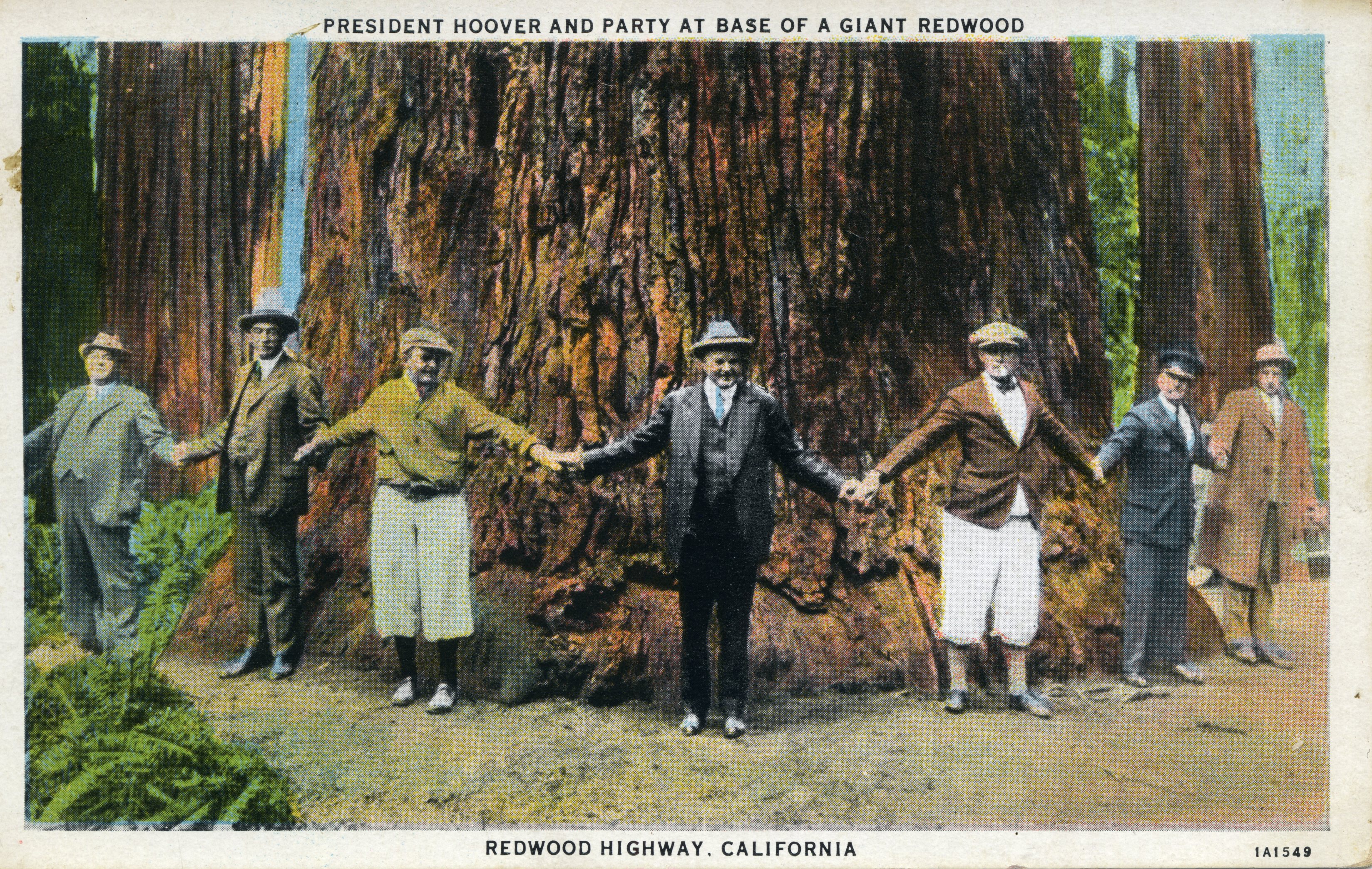 A postcard of President Hoover, and a group of friends, visiting the Avenue of the Giants prior to his inauguration.